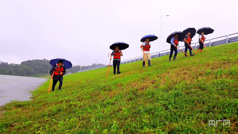 在位于湖口县的长江干堤长棉圩堤防汛值班点,一群女同志身穿雨衣,准备去巡堤。她们沿着堤坝背面,行走在草丛中,一手拿竹棍,一手打雨伞,边走边拨,仔细巡堤查险。