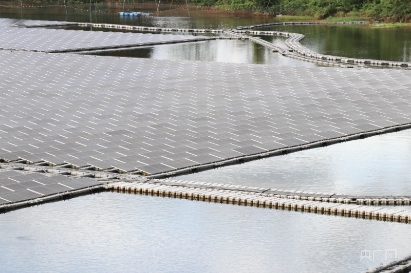央广网吉安7月4日消息(记者刘培俊)在江西省万安县韶口乡渔光互补光伏发电站,放眼望去,开阔的水面上,一排排深蓝色的太阳能光伏板鳞次栉比,一眼望不到头,在阳光照射下正源源不断地产生绿色电能,而在太阳能光伏板下的水域养殖着大量生态鱼。