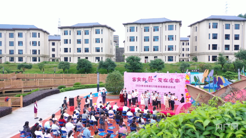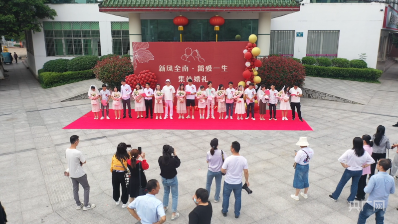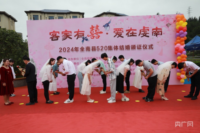5月20日,在全南县若湖公园户外颁证基地举办的一场集体婚礼上,11对新人携手缓缓入场,双方对拜赠花,共同宣读婚事新办简办倡议书,现场几位“特邀嘉宾”给新人颁发结婚证书,送上新婚寄语。