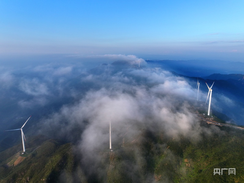 央广网吉安9月1日消息(记者胡斐)8月29日,江西省吉安市泰和县水槎乡天湖山上云雾缭绕,一台台高大的风力发电机组耸立在高山之上,壮观如画,云海与风电机组相映成景,构成了一幅人间仙境,美不胜收。