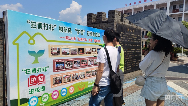 学生家长浏览“扫黄打非”公益宣传板(央广网发 梁紫微 摄)