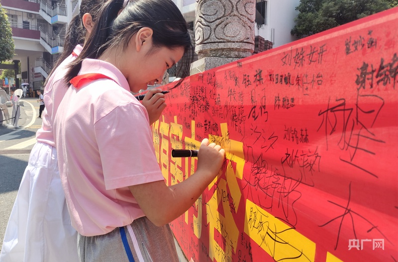学生在横幅上签名(央广网发 梁紫微 摄)