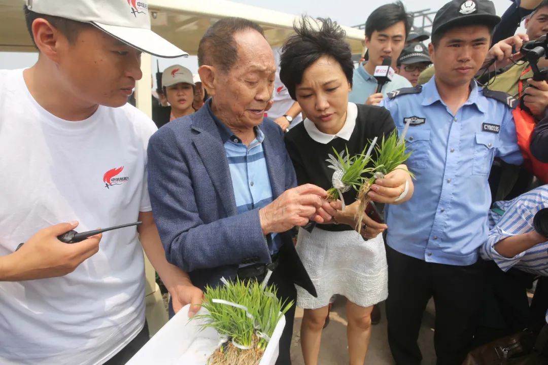 袁隆平在山东青岛参观试验田,为工作人员传递海水稻秧苗杂交水稻亩产量突破1000公斤后