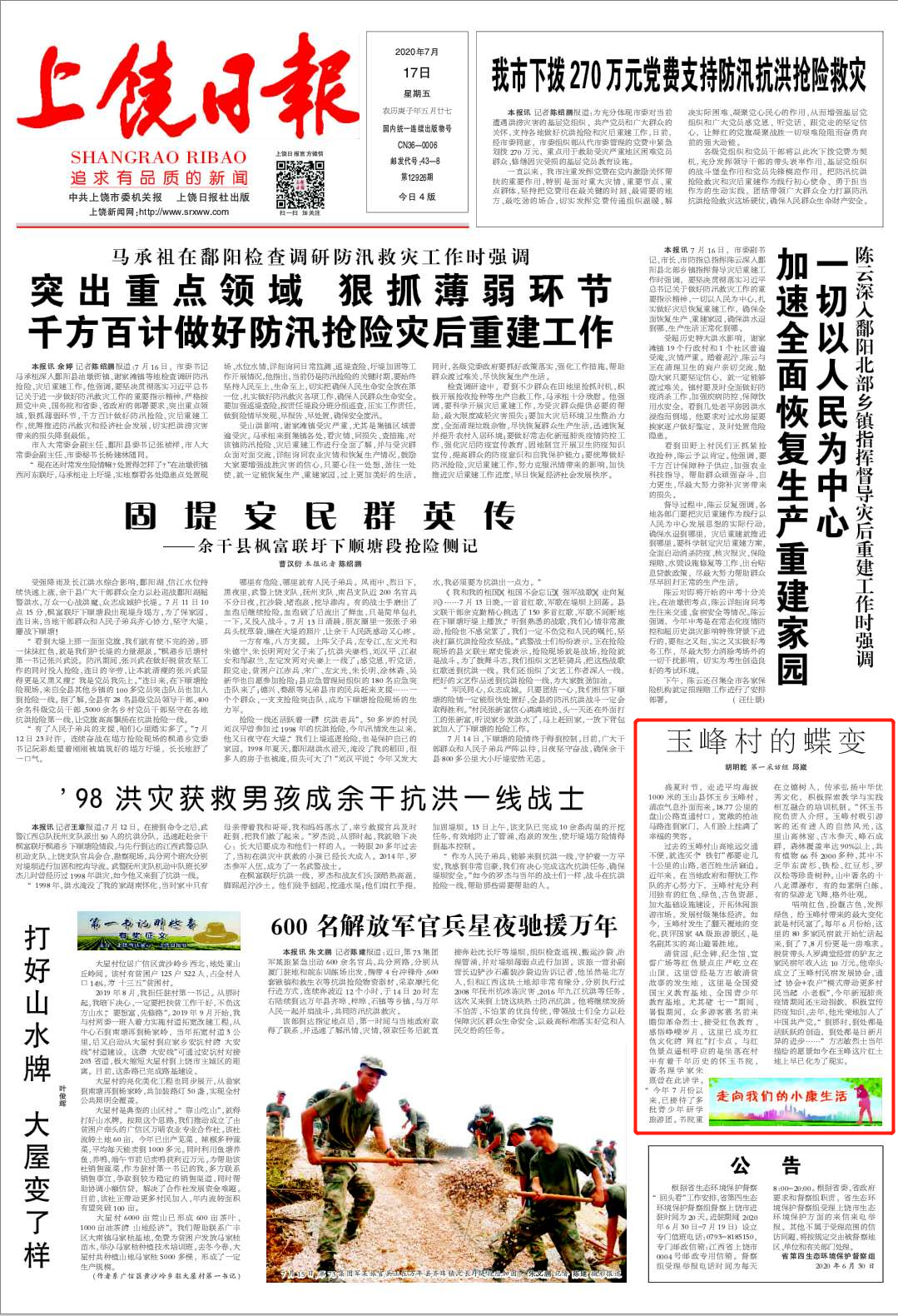7月17日,《上饶日报》头版刊发《玉峰村的蝶变》一文,点赞我县怀玉乡玉峰村独具特色的发展模式,让这里的村容、村貌发生了巨大变化,百姓生活水平大幅提升,一幅美丽乡村的画卷在眼前徐徐展开。现全文刊发,以飨读者。