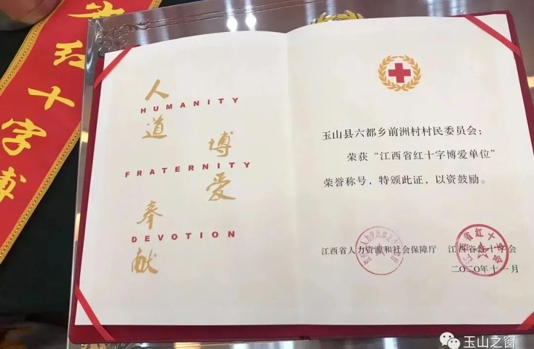 11月18日,江西省红十字会第八次会员代表大会在南昌召开,会议表彰了27位“江西省红十字博爱大使”和30个“江西省红十字博爱单位”。玉山县六都乡前洲村村民委员会喜获“江西省红十字博爱单位”殊荣,上饶市仅三个单位获此荣誉。
