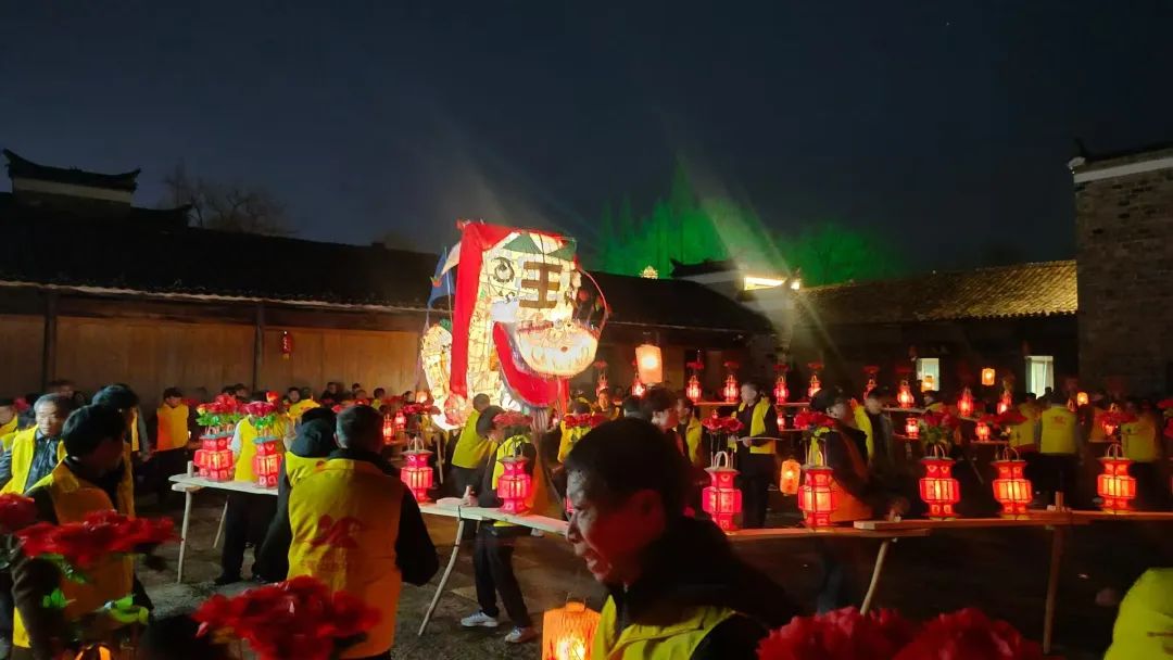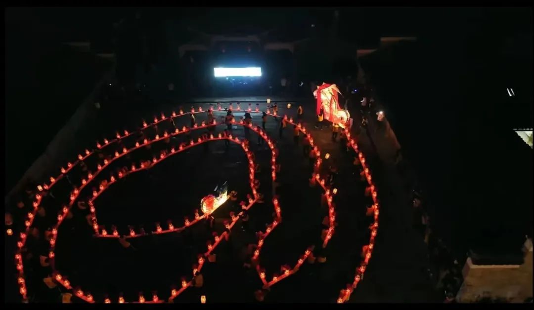 伴随着唢呐和锣鼓声,龙灯如一条金色巨龙蜿蜒而出。龙灯由120节板凳连接而成,每节板凳上都装饰着精美的花灯,烛光摇曳,熠熠生辉。舞龙者们身着统一的服装,步伐矫健,动作娴熟,他们默契配合,时而将板灯高高举起,时而盘旋舞动,龙身起伏,气势磅礴,引得现场观众阵阵欢呼。