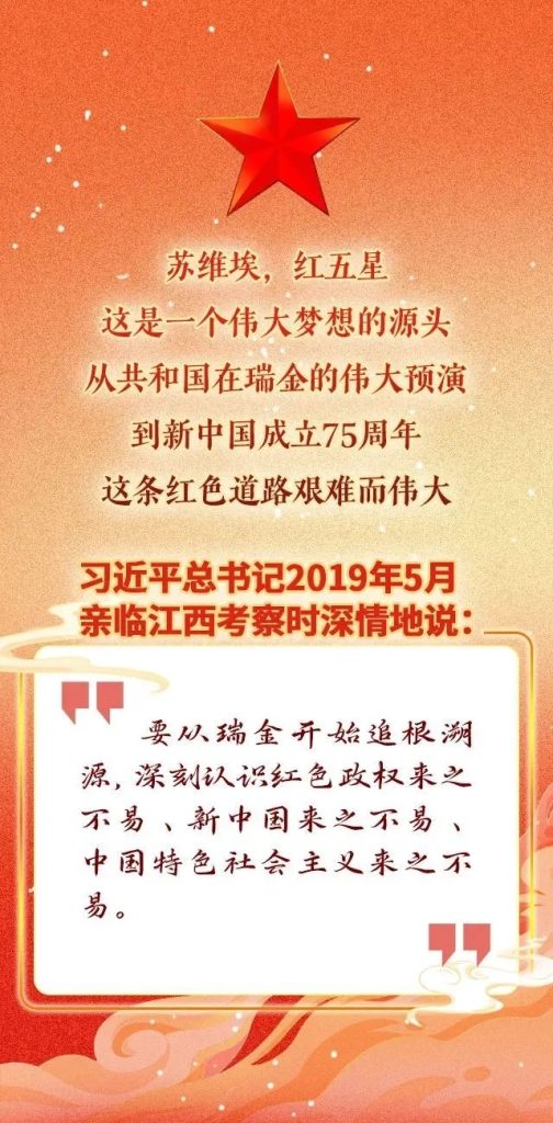 苏维埃,红五星,这是一个伟大梦想的源头。从瑞金到北京,一颗颗闪闪的红星,承载着中国共产党人的初心与使命,照亮了共和国前行的道路。为庆祝中华人民共和国成立75周年,赣州市融媒体中心联合江西组工微讯、大江网、瑞金市融媒体中心共同推出《从瑞金到北京:共和国之路》特别策划。让我们跟随这颗红星,一起追寻共和国波澜壮阔的伟大光辉历程。