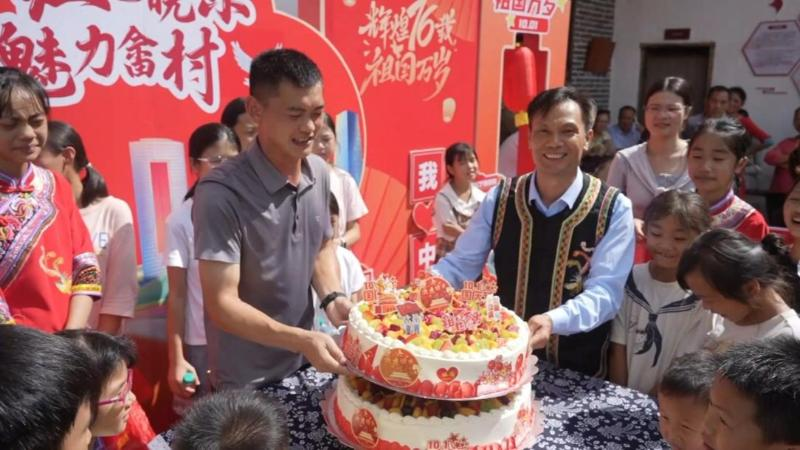 升旗仪式后,畲族风情展演热闹开场。村民们身着蓝、红为主色调的畲族传统服饰,踩着欢快的节拍跳起自编舞蹈,竹竿开合间,清脆的碰撞声与欢声笑语交织,游客们也纷纷加入,在互动中感受畲族文化的独特魅力。现场还摆放着定制的蛋糕,村民与游客围坐在一起,共同切开甜蜜的蛋糕,分享节日的喜悦。“带孩子来这儿不仅参加了升旗仪式,还体验了畲族舞蹈,这样的体验特别有意义。”游客郭丽珍笑着说。
