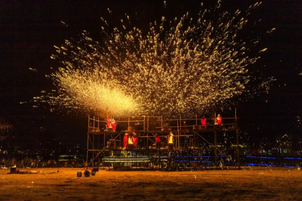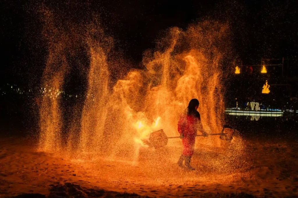 壮美的打铁花在空中绽放出无数朵金花,震撼的火壶表演也让现场欢呼声与尖叫声不断。