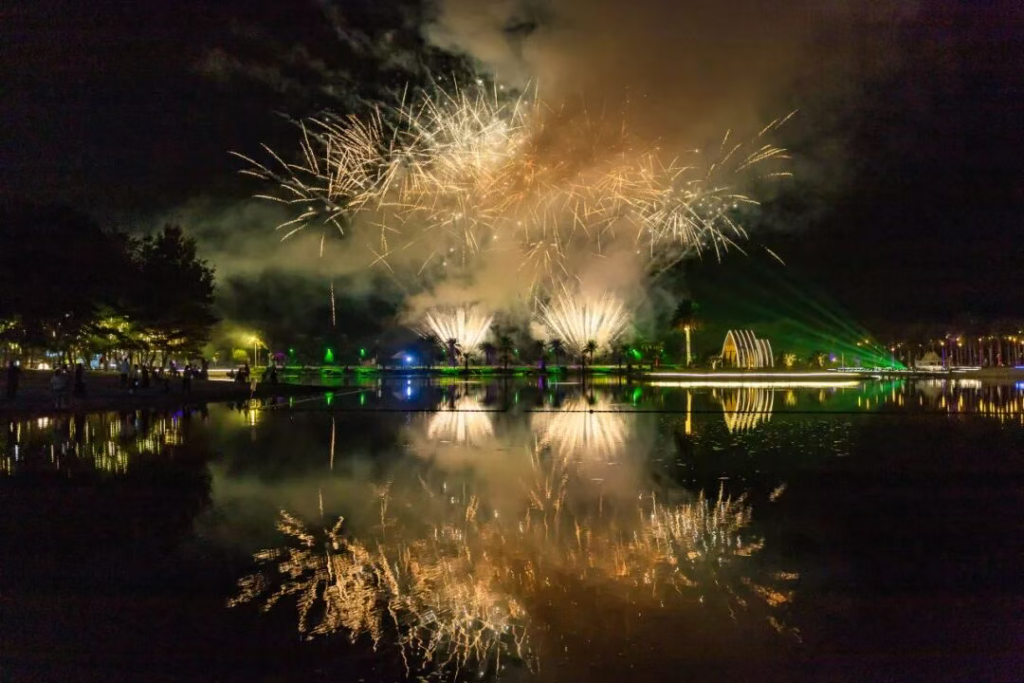 夜晚的最后一场精彩,以浪漫烟花秀结尾。月亮之下,璀璨的烟花在夜空中绽放,将整个假期的欢乐氛围推向高潮。