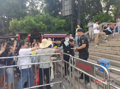 10月2日,南昌滕王阁景区在36.7℃的高温下迎来客流高峰,因主楼实行限流,骄阳下排队的游客难免心生焦躁。这时,保安小哥张灵杰手持喇叭站了出来,用一个充满智慧的方式为现场带来“凉意”。