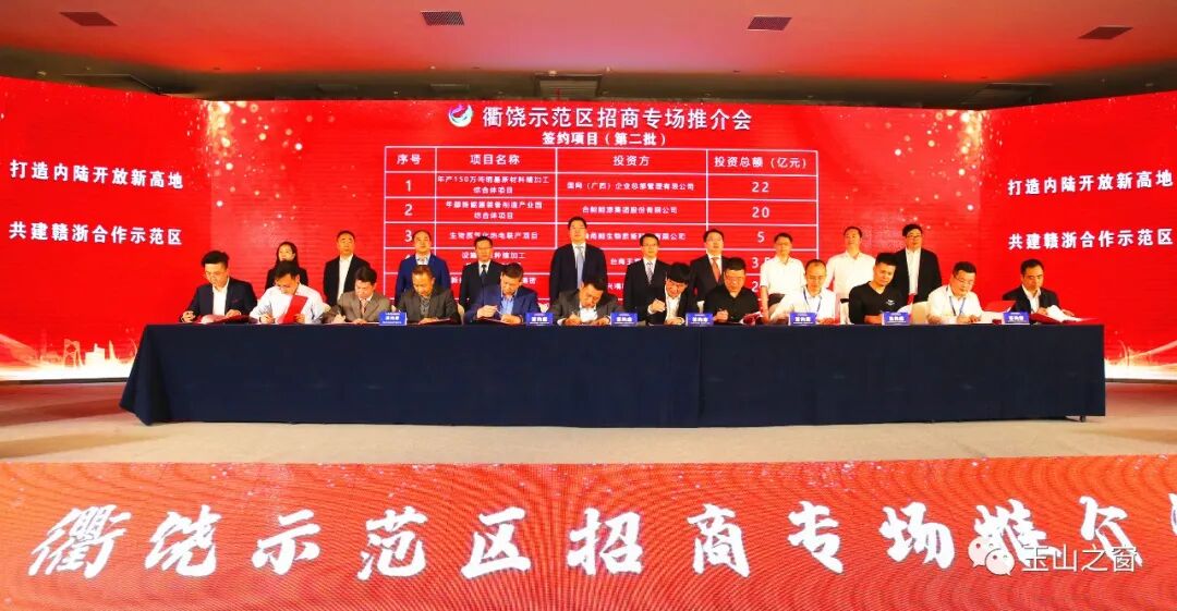 在日前举行的第二届全球饶商大会衢饶示范区招商专场推介会上,签约项目17个,总投资162.89亿元,其中衢饶示范区签约投资20亿元以上项目5个。这标志着衢饶示范区(玉山区块)招商引资工作取得新突破,各项基础设施建设扎实有序推进并具备了项目落地的条件。