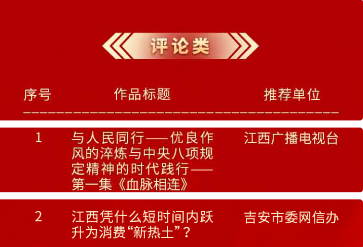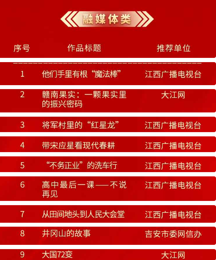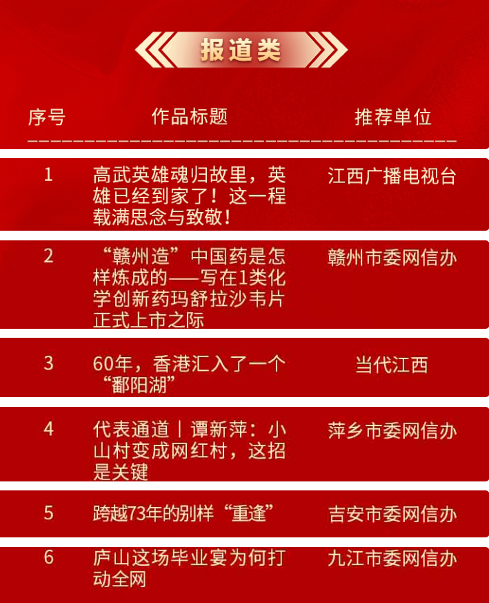 为加强网络正能量建设,推动我省创作更多具有引领力、凝聚力、感召力、影响力的新时代网络精品,在各地各网站推荐基础上,经过内容初审、初评筛选、集中复评等环节,已评选出2025年上半年江西省正能量网络传播精品(20件),其中报道类6件、评论类2件、融媒体12件,具体名单如下: