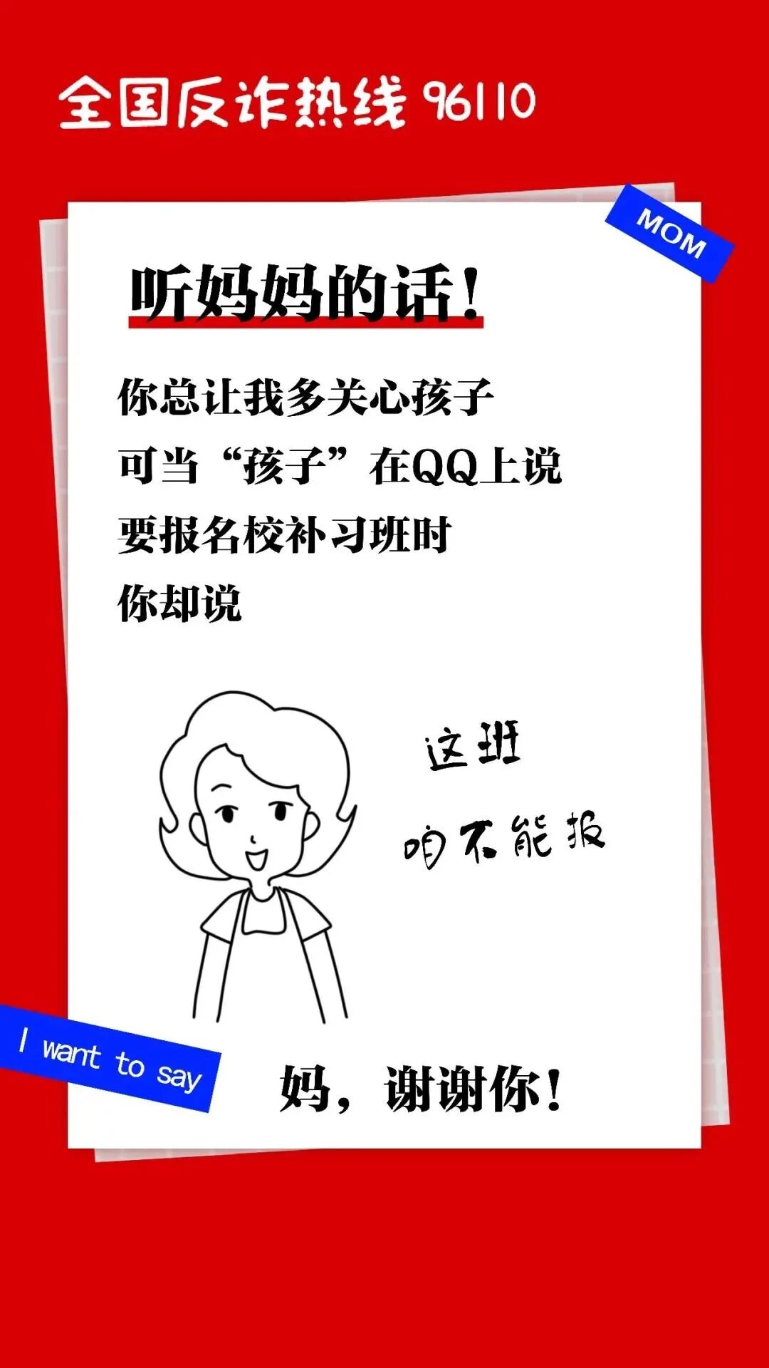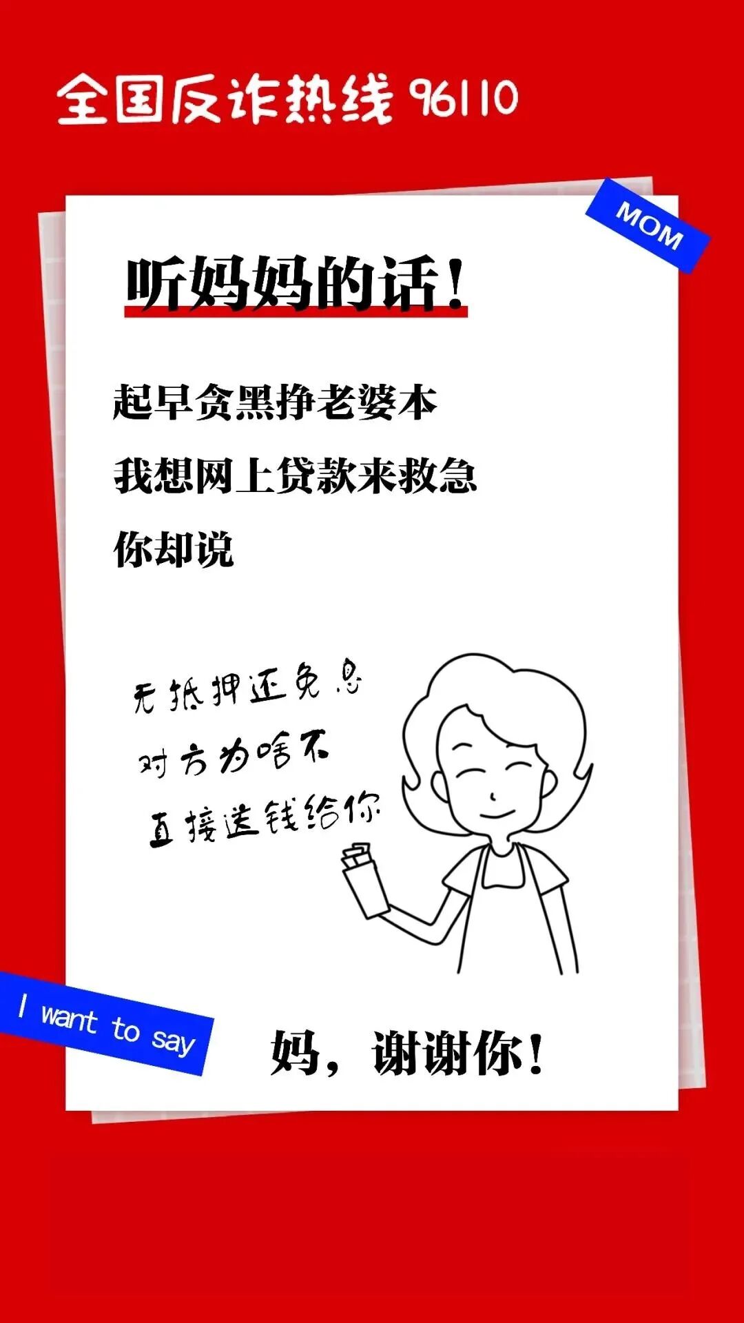 听妈妈的话,别上当受骗啦! 2021年5月10日 9:22 阅读(7057) 外面的诱惑你一定要小心 陌生人的话千万别轻信 虽然妈妈唠唠叨叨 可她说的一点没错 听妈妈的话 别让她担心啦! 听妈妈的话 别上当受骗啦! 祝天下所有的妈妈:母亲节快乐! 来源:上饶市反电信网络诈骗中心 本文来自网络,不代表中国博士县—玉山之窗立场。转载请注明出处: https://www.yszc.com.cn/13946.html