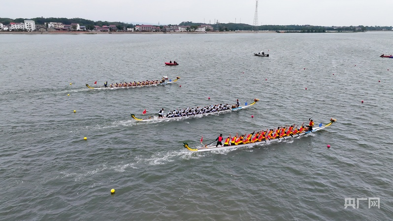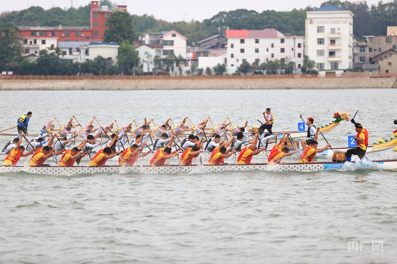 赣江万安段江面如练,随着发令枪响,一艘艘龙舟如箭离弦,击水而进。鼓点铿锵有力,舵手目光坚定,22名划手动作整齐划一,木桨翻飞间激起千层浪,龙舟在碧波中划出优美弧线。“一二!一二!”的号子声沉稳雄浑,与岸边数万观众的呐喊助威声交织,如浪潮般席卷江面,将现场氛围推向高潮。