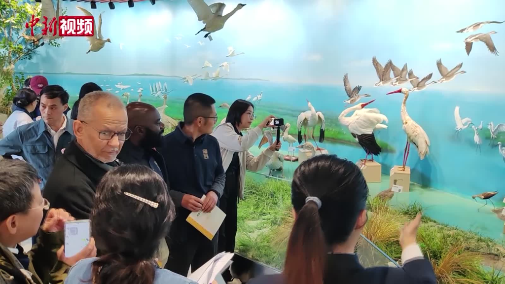 11月17日,中外嘉宾在鄱阳湖湿地和候鸟宣传教育中心参观,了解鄱阳湖人文地理、动植物资源和相关保护工作开展情况。 刘力鑫 摄