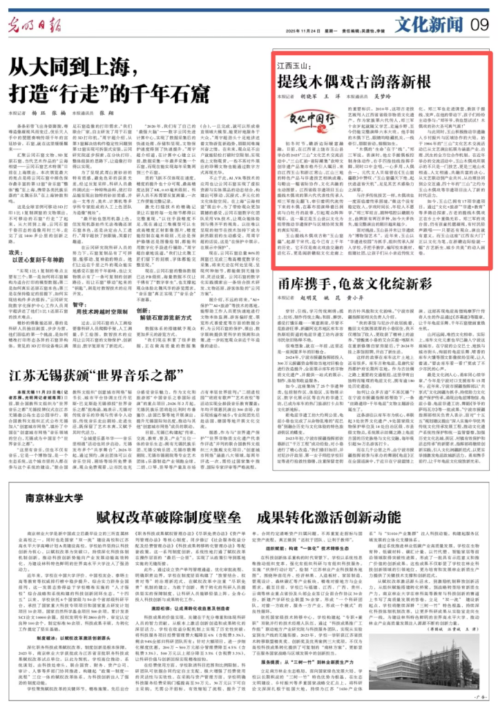 如今,玉山已拥有17项非遗项目。通过“文化+旅游”“非遗+教育”等多路径探索,古老的提线木偶戏正在乡土中重焕光彩。郑三军的戏台前,仍有孩童托腮凝视,有村民轻声跟唱——只要还有观众,演出就有意义。而玉山这座“江西东大门”正以文化为笔,在浙赣边际绘就一幅“古艺新生、城乡共美”的动人画卷。(光明日报记者 胡晓军 王洋 玉山县融媒体中心记者 吴梦玲)