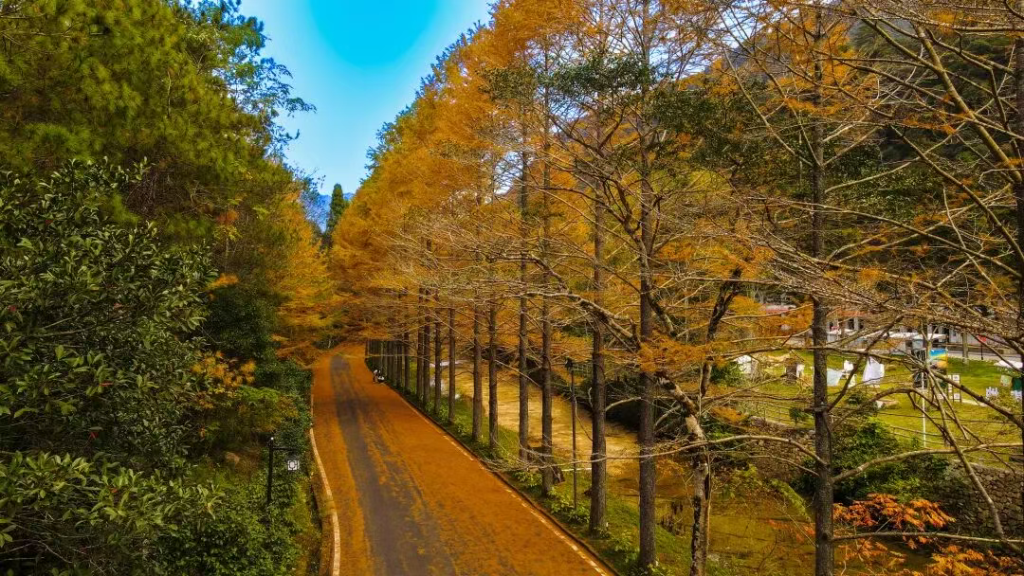 走进大茅山,仿佛步入一幅浑然天成的油画。从盘山公路到逍遥大道,从马溪河岸到笔架山下,水杉林披上盛装,浅红、深红、金红层层晕染,阳光穿过挺拔的树冠,洒下斑驳光影,形成一条条梦幻的“红杉隧道”。游客漫步其间,脚下是沙沙作响的落叶“红毯”,眼中是如火如荼的林海,每一步都踏在秋冬交织的诗意里。