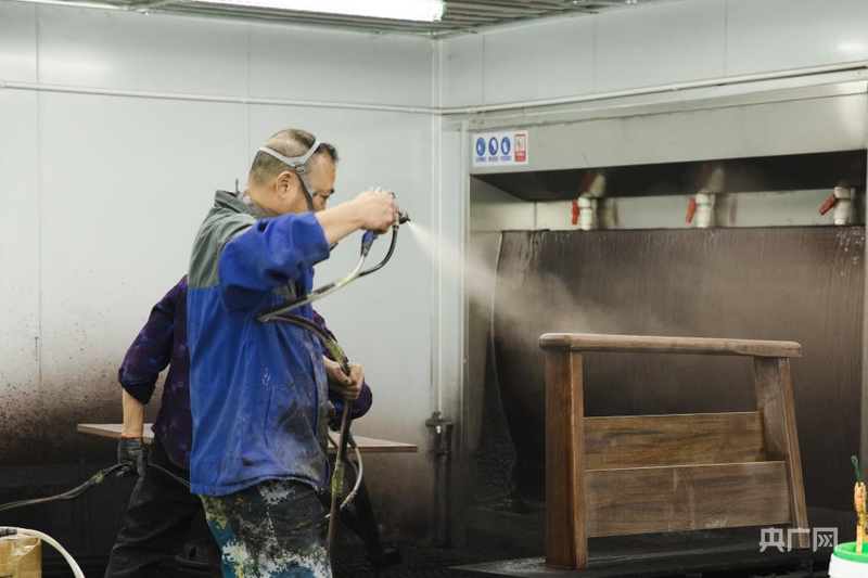 林森泰家具有限公司操作车间内工人使用水性漆喷绘家具(央广网见习记者 尹博 摄)