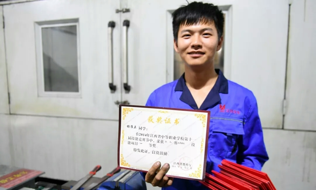 出生于1996年的钳工杨准正,用他的职业成绩单打破了这种刻板印象:实习期获企业职业技能比赛第一名,提前转正;两次斩获全国职工职业技能大赛钳工竞赛江西省第一名;29岁获评全国劳动模范……不骄不躁,二十九岁的杨准正还主动向智能化生产靠拢,升级“智能设备运维”技能点,从“菜鸟”一路闯关,现在已经能带领团队熟练攻关各类设备运维操作。