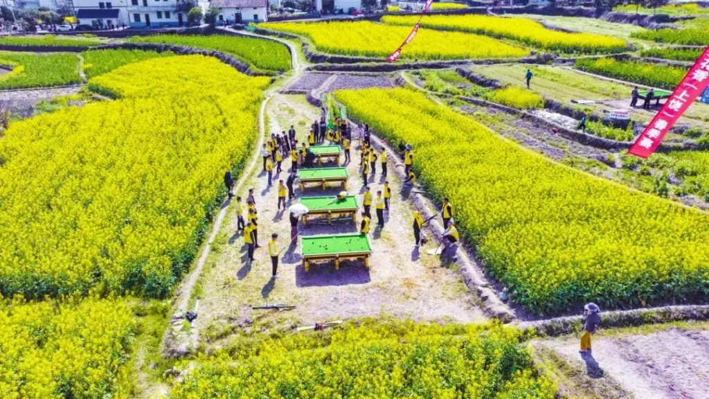 近年来,玉山县着力擦亮“中国台球之都、世界台球名城”品牌,通过举办国际赛事与民间“村台”活动双轨并行,持续扩大品牌影响力。其中,“江西村台”作为特色载体,创新采用“台球+”模式,将赛场延伸至油菜花田等自然景观中,并融合乡村音乐节、民俗展演、农产品展销等内容,实现体育、文化、旅游与农业的深度融合。