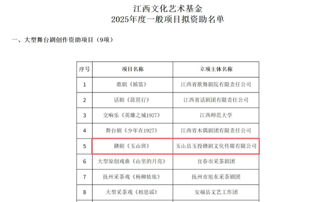 据了解,江西文化艺术基金立项经专家严格评审,此次入围的9个大型舞台剧涵盖舞台剧、话剧、歌剧等多个类别,《玉山班》的成功入选,不仅是对玉山县赣剧团创作实力的肯定,更填补了本次大型舞台剧类赣剧作品的空白。