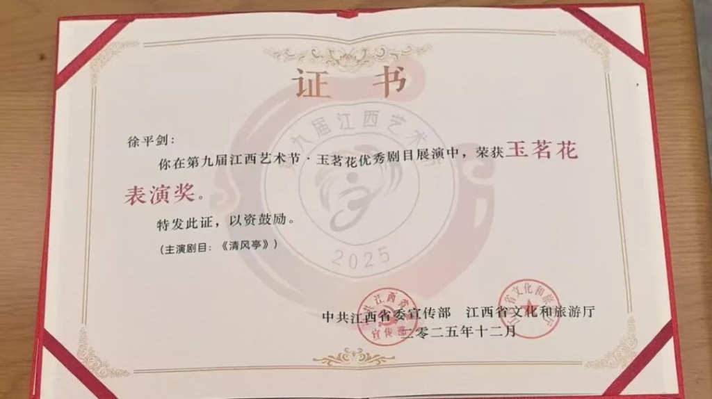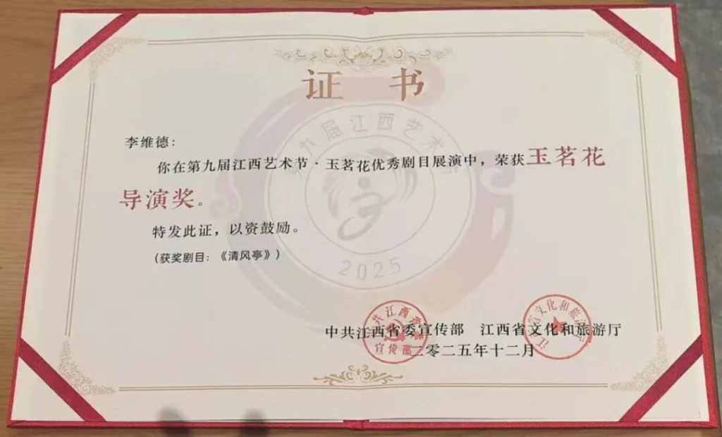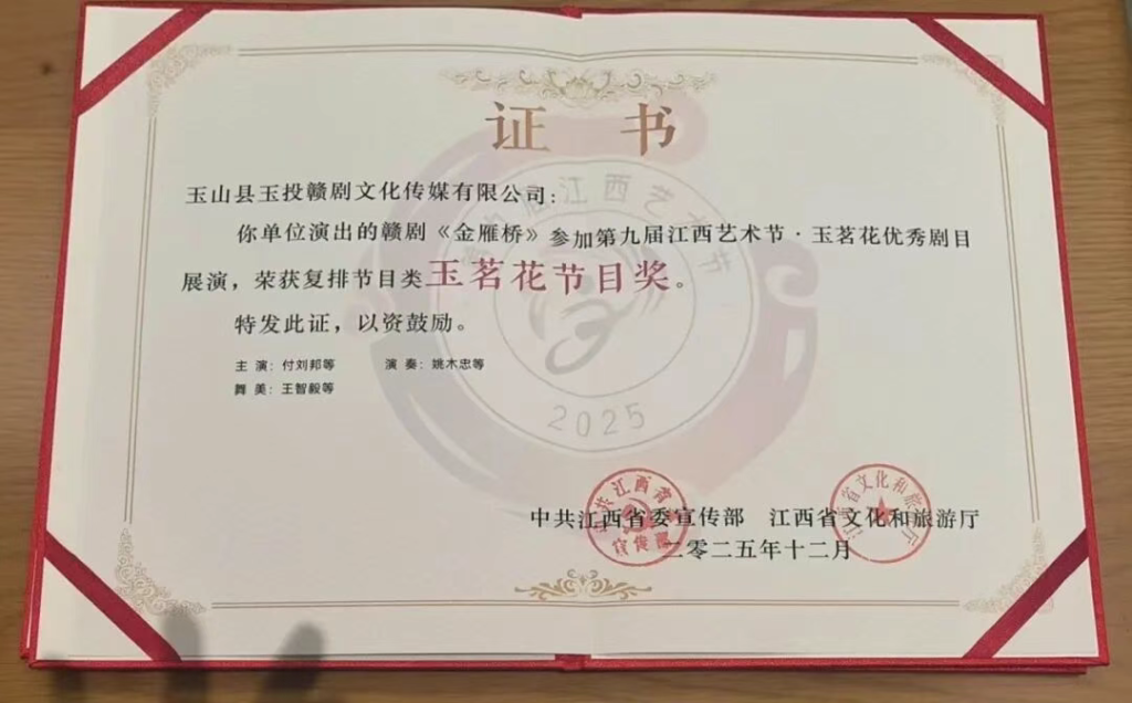 捷报再传,在第九届江西艺术节获奖名单中,玉山县赣剧团同样收获满满。剧团特聘艺术顾问、国家一级演员李维德老师凭借复排经典赣剧《清风亭》,摘得玉茗花优秀剧目展演导演奖;饰演该剧主要角色张元秀的优秀演员徐平剑,以精湛的舞台技艺荣获表演奖;复排经典折子戏《金雁桥》亦斩获复排节目奖,多项荣誉加身,尽显玉山赣剧的深厚底蕴与不凡实力。
