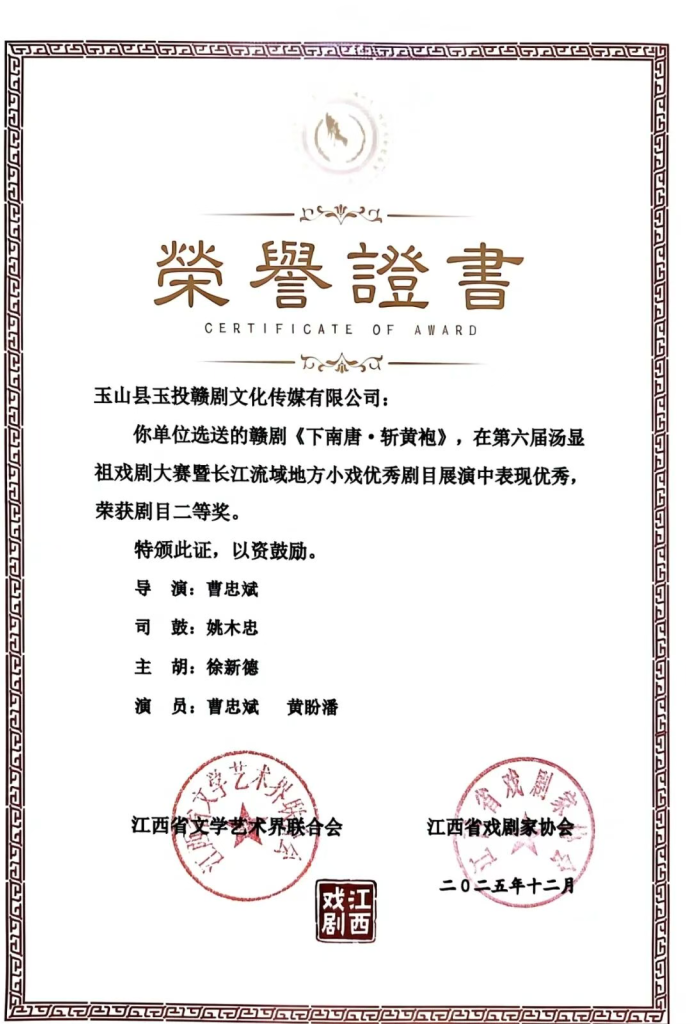 日前,第六届汤显祖戏剧大赛暨长江流域地方小戏优秀剧目展演在抚州圆满收官。玉山县赣剧团艺术总监曹忠斌老师携经典剧目《下南唐·斩黄袍》登台献艺,凭借大花脸行当的精湛技艺征服全场,一举斩获剧目二等奖,为玉山非遗文化再添荣光。