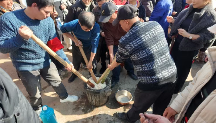台下,村民章征苗笑得合不拢嘴:“为了这场舞龙和‘农具秀’,我们哥几个排练了半个月哩!”不远处的“年味工坊”里,打糍粑的咚咚捶打声沉稳有力,刚出锅的米糖香甜四溢。