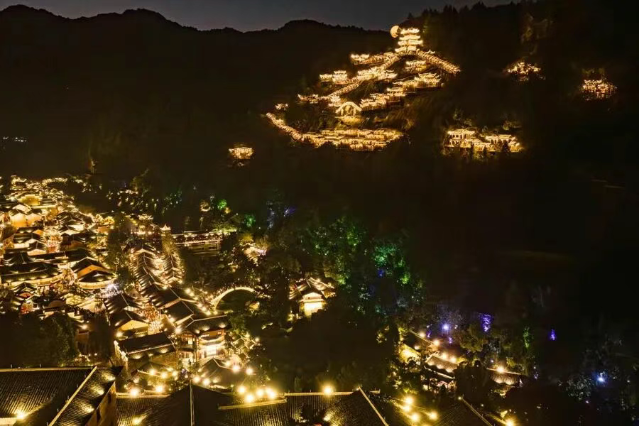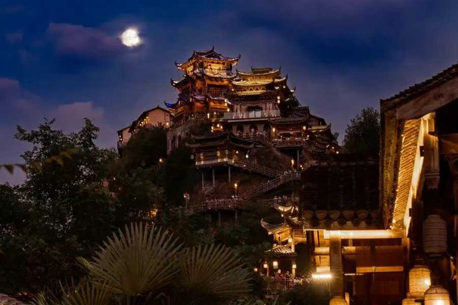 望仙谷景区灯火通明,木质楼阁如梦似幻。