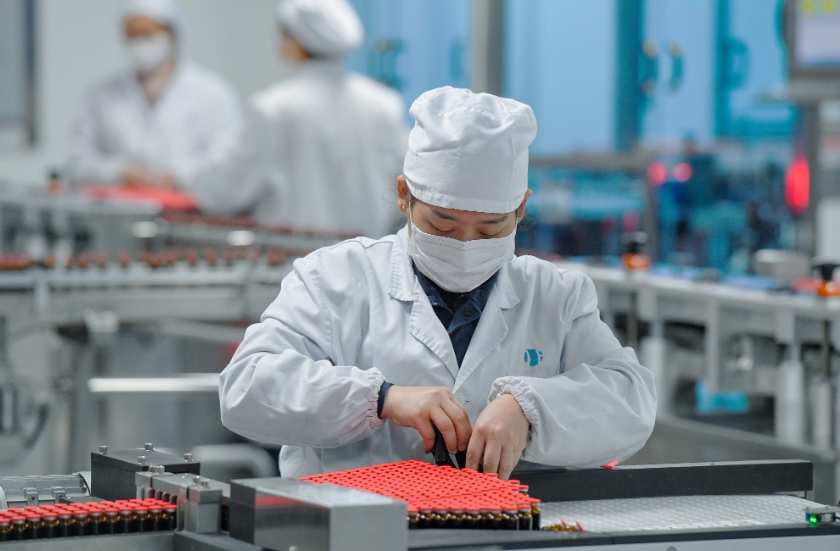 在青峰医药集团有限公司生产线上,员工在生产药品。胡江涛/摄