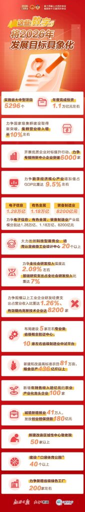 一图速览2026年及“十五五”江西发展目标 2026年1月27日 16:42 阅读(70) 来源:江西发布、大江新闻时政频道(制图:方曦) 本文来自网络,不代表中国博士县—玉山之窗立场。转载请注明出处: https://www.yszc.com.cn/144721.html