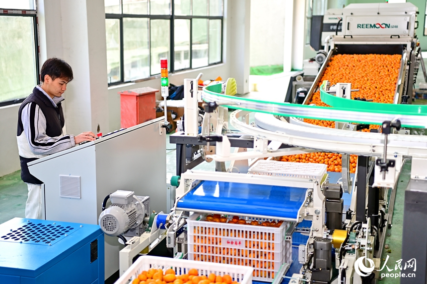 江西省抚州市南丰县蜜桔产业园的一家果品加工企业,工人在智能分选加工生产线上筛选蜜桔。人民网记者 朱海鹏摄