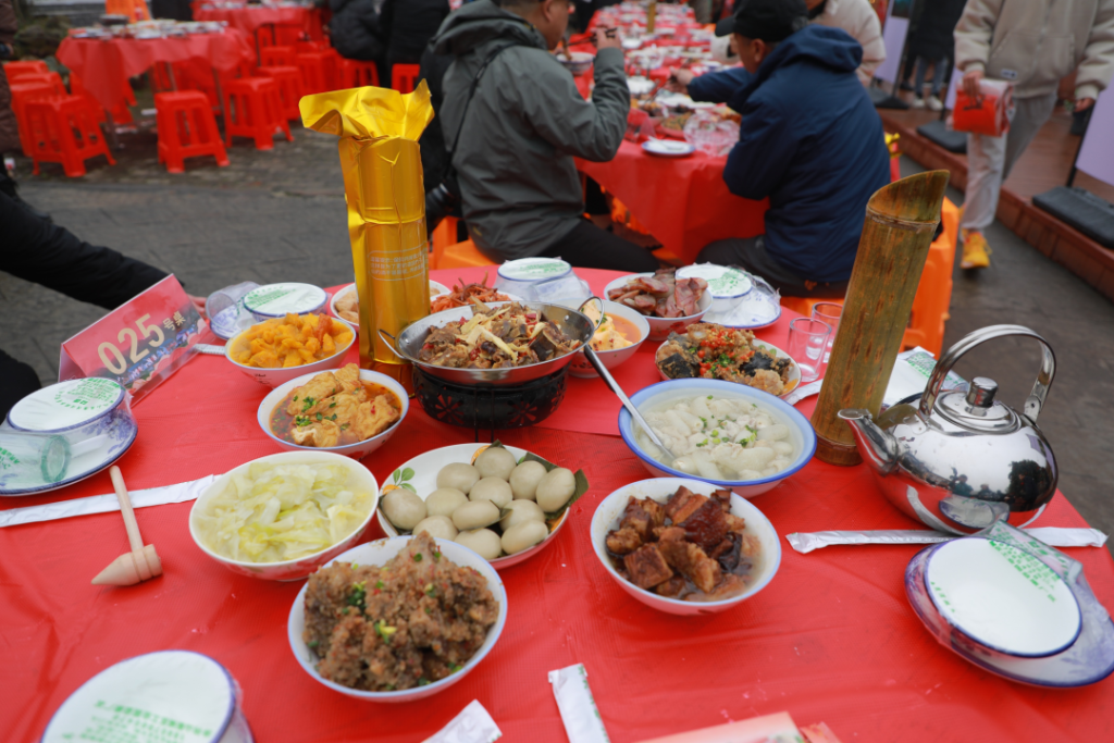 只见村民们端着热气腾腾的菜肴,将一道道有着“家的味道”的美食送到每一位宾客面前。“来来来,大家别客气,趁热吃!”软糯香甜的特色米果、内里鲜嫩的酿豆腐、咸香扑鼻的腊肉等传统美食依次排开,还有鲜味十足的山岚冬笋炖板鸭、油润醇香的竹笼稻香蒸大鹅等特色菜肴令人垂涎,菜名一听也满是吉祥寓意,透着乡野的鲜活气息。