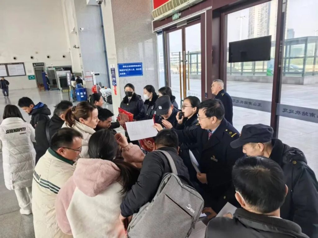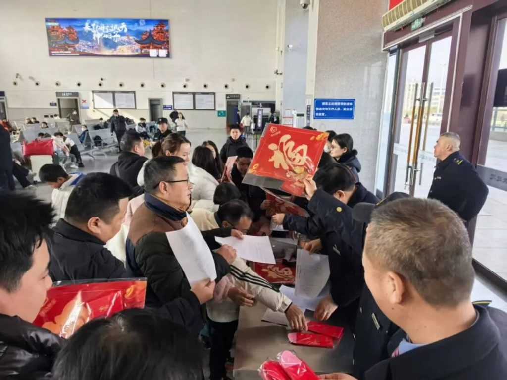 “大姐,行李别乱放,贵重物品要贴身带啊!”“小伙子,陌生链接别点,春运骗子套路多!”在送福的同时,一份份特别的“安全锦囊”也被送到旅客手中。民警和车站客运工作人员共同将反诈、防盗、乘车安全等知识,巧妙融入春节祝福。