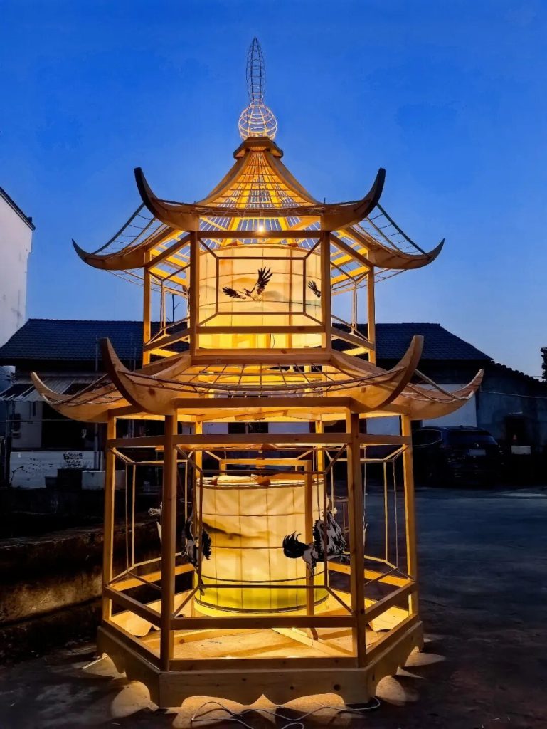 此次定制的走马灯,规格远超寻常作品——直径两米五、高四米,分为上中下三层。既要兼顾拆装与运输的便捷,又要最大程度呈现灯彩的精美,这无疑是一场艰巨的挑战。汪宣烈带领团队沉下心来钻研,在保留传统样式精髓的基础上大胆革新:将走马灯的竹篾骨架换成木质结构,通体采用榫卯工艺,既增强了稳固性,又提升了展示适配性。