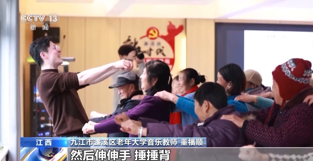 九江市濂溪区老年大学音乐教师 董福顺:我觉得音乐它是有律动的,结合那个律动再加这些动作,然后伸伸手、捶捶背,我觉得这不就是生活中的动作,你把它再带到课堂里边儿,带到音乐里边儿,课堂就不一样。