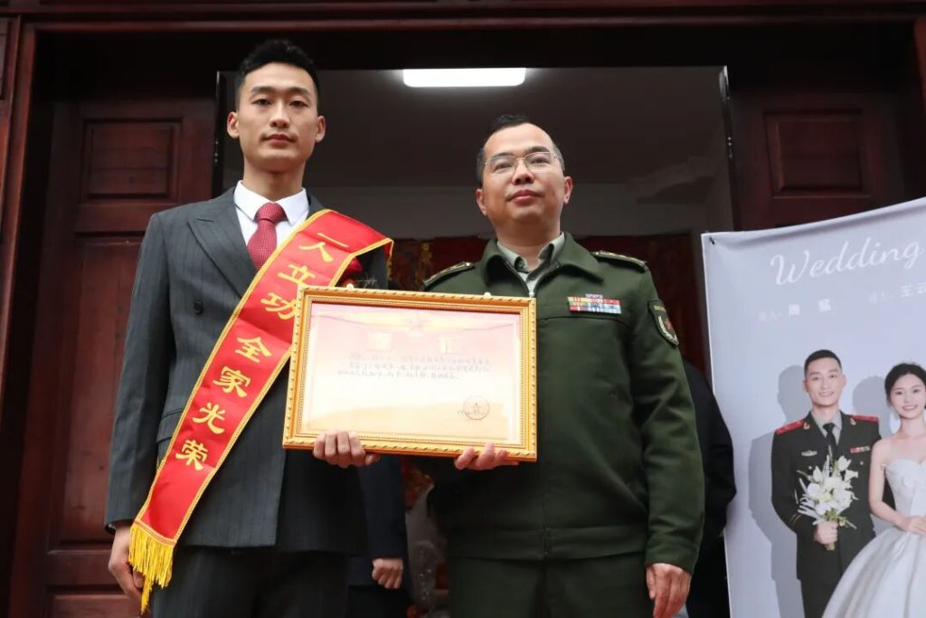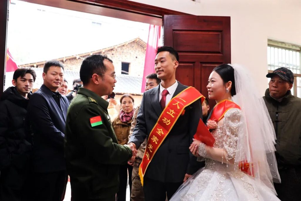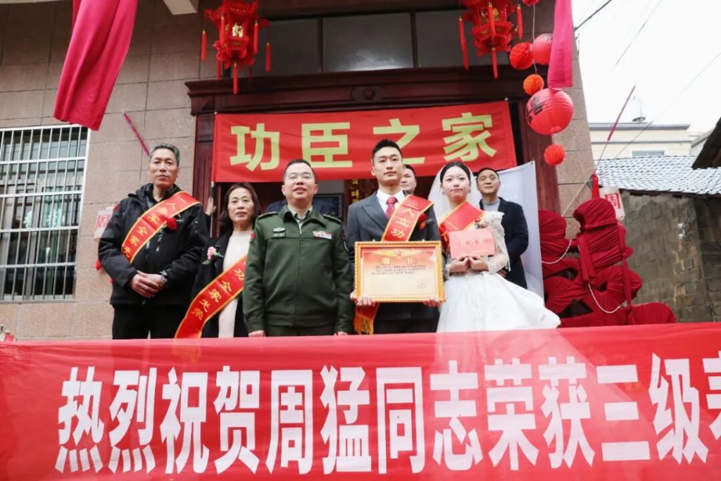 下午3时,欢快的锣鼓声响彻横溪社区。在乡亲们热烈的目光中,县人武部上校政委喻斌一行来到婚礼现场,将三级表彰喜报、立功证书和慰问金郑重送到周猛同志及其家人手中。“一人立功,全家光荣”的大红绶带佩戴在周猛及家人胸前,映照着他们喜悦的泪光。