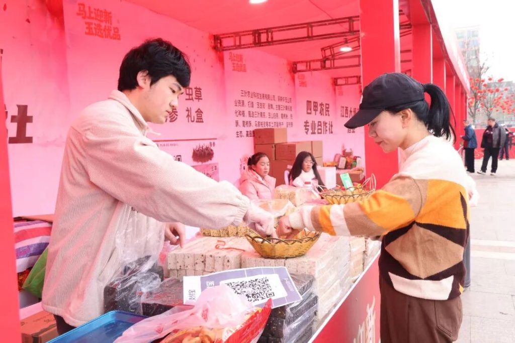 另一旁,吆喝声、询价声、欢笑声交织,浓浓的烟火气扑面而来。不少市民携家带口逛大集、挑年货,在试吃与选购中感受传统年俗。玉山县四甲农民专业合作社理事长祝汉河现场推介:“我们带来了红薯片、豆腐乳、临湖大蒜等,这些土特产都是原生态无添加的,我们就是要把山里的好东西送到市民餐桌。这次大集客流量大,接了不少订单,既拓宽了销路,也让更多人认可我们的乡土好货。”