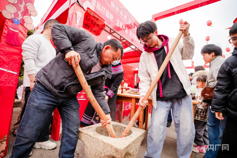 游客体验打糍粑(央广网发 肖江峰 摄)