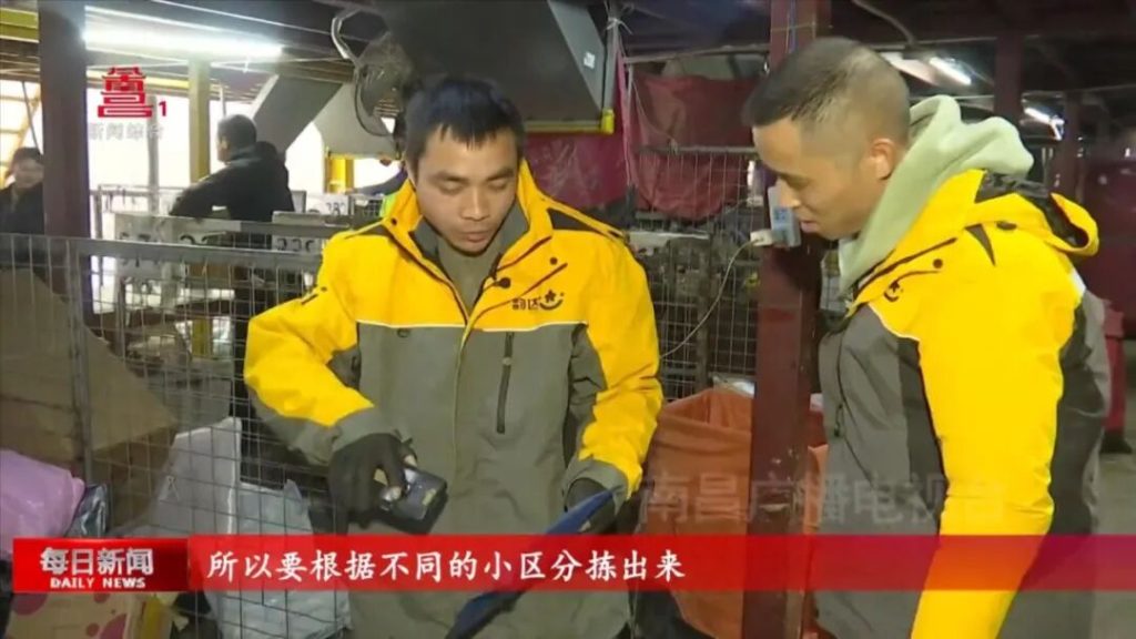 快递员徐龙文:“对,从那个流水线下来,分到这里。”