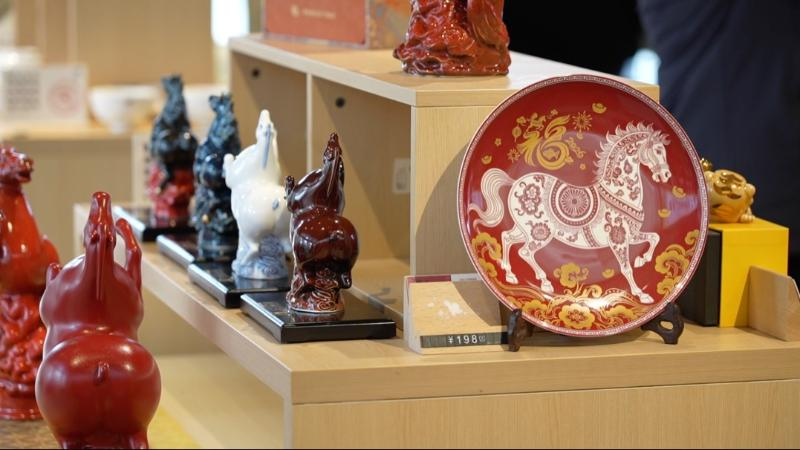 在景德镇陶阳里景区内的景德镇陶瓷官方旗舰店里,《福马迎春》系列文创产品陈列整齐,作品兼具汉唐骏马的刚健风骨,以及马踏祥云、昂首奋蹄的劲姿,格外醒目,吸引了众多游客驻足观看和选购。