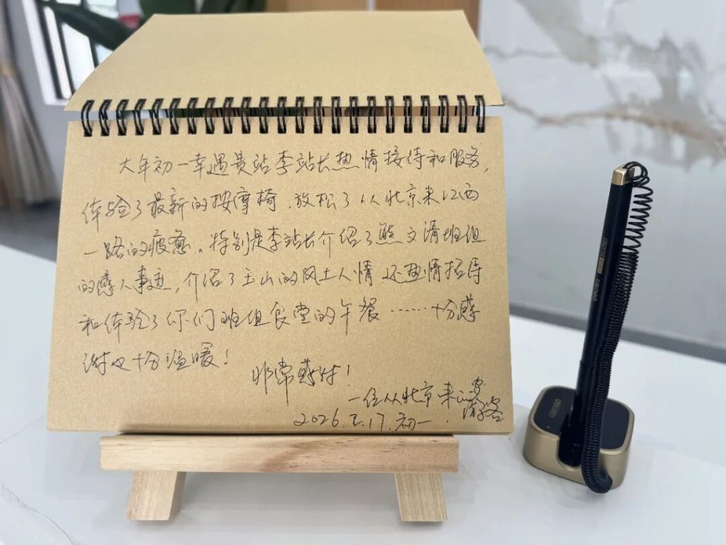 临近中午,考虑到游客身在异乡,熊文清班组热情邀请他前往职工食堂共享午餐。热腾腾的家常菜、亲切的陪伴交流,让这位异乡游子在千里之外感受到了家一般的温暖。“这份细致入微的关怀,让我的江西之行有了最温暖的开篇,这份感激与感动,我要留给玉山!”离别之际,游客特意在留言簿上写下真挚感言,对“熊文清班组”工会驿站的热情接待与暖心服务给予高度评价,这封饱含深情的留言,也成为了驿站新年收到的第一份珍贵认可。
