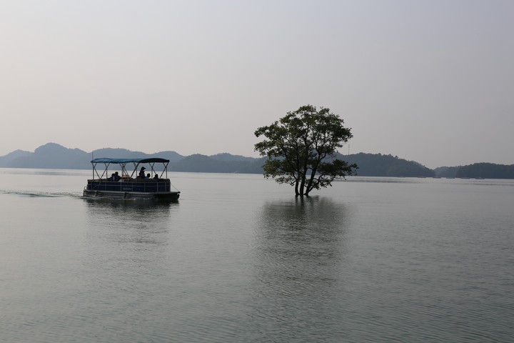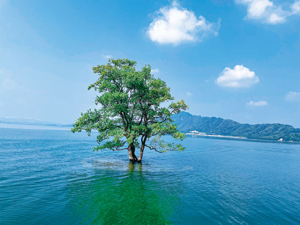 庐山西海,江西庐山脚下一座大型人工湖。20世纪70年代蓄水后,群山成岛,达8000余座。其中最小的“岛”,便是这棵乌桕。它曾矗于山巅,如今独立湖心,尽管只有树干和树枝露出水面,却年年枝繁叶茂,“沧海一树”“树坚强”的声名远播。