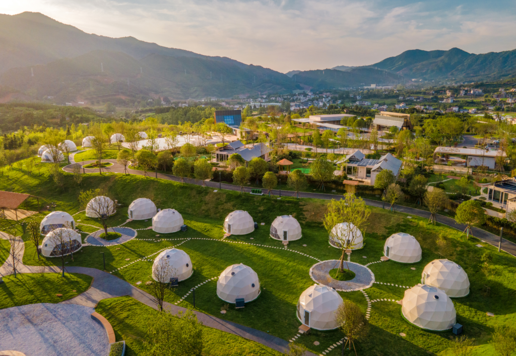 崇义县米墅拾野山舍温泉度假村,造型别致的特色小屋错落有致,为游客提供休闲度假、亲近自然的舒适体验。(崇义县文广旅体局供图)