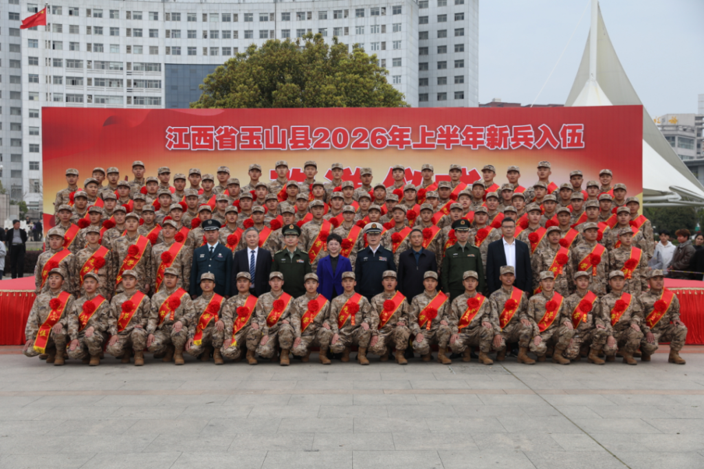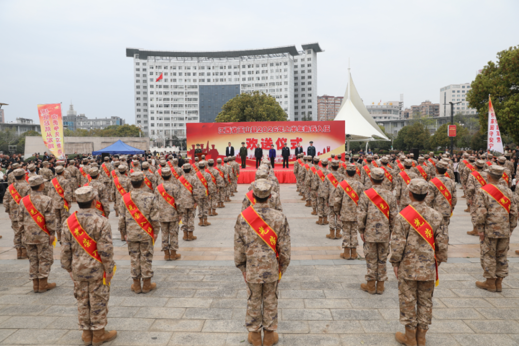 3月16日,玉山县在三清广场举行2026年上半年新兵入伍欢送大会,为踏上征途、走进军营的100余名热血青年送行。县委常委、副县长韩庆云,县委常委、县人武部上校部长付霖,县人武部上校政委喻斌,县人大常委会副主任杨军,县政协副主席罗永松出席。