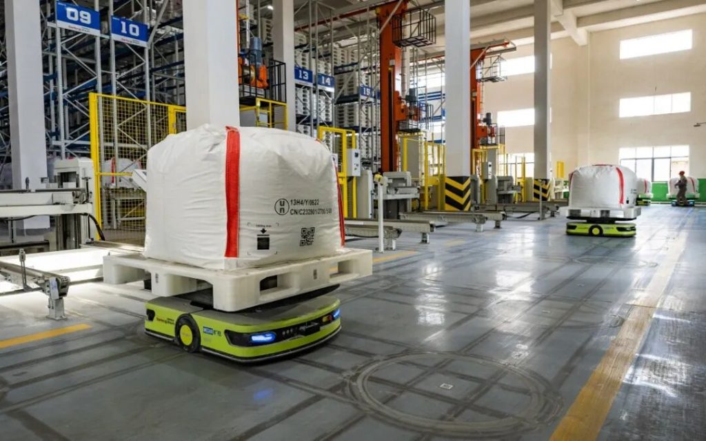 高新区锂电新能源产业园赣锋锂业的车间内,AGV转运机器人、堆垛机器人等在智能程序下执行打托备货工序。记者赵春亮 摄