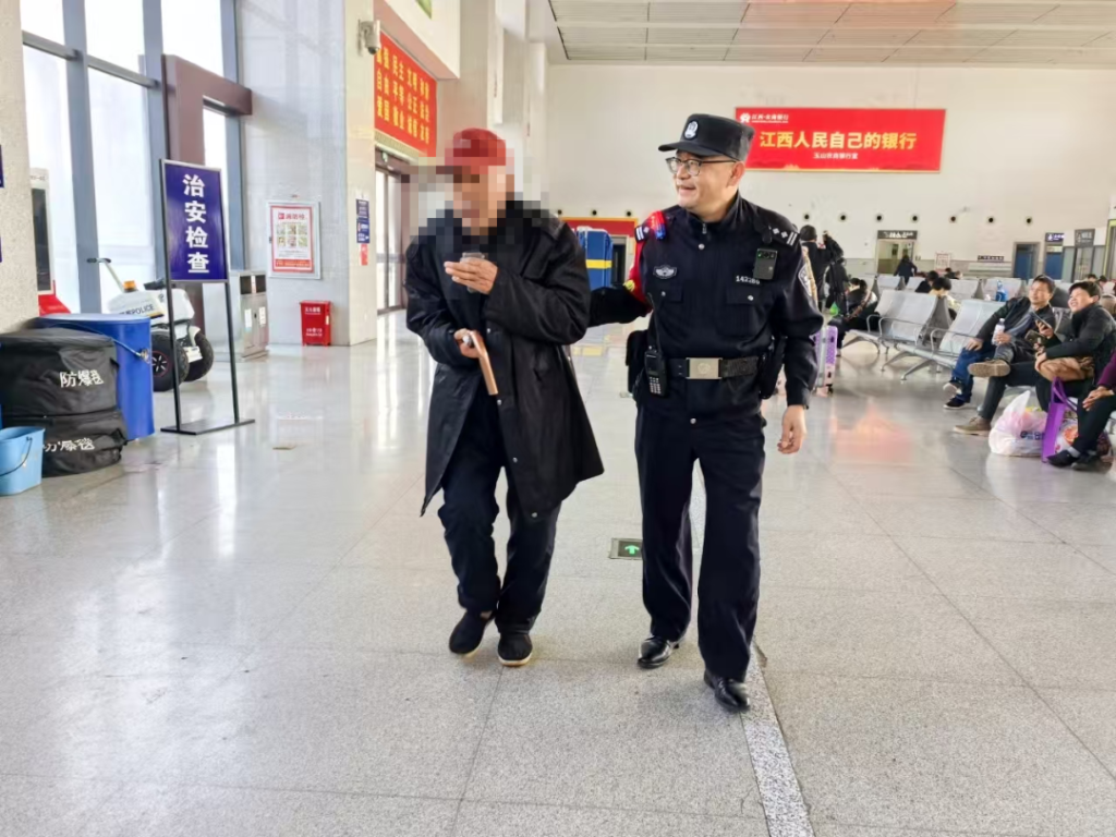 事发当天,玉山南站派出所民警执勤时,透过玻璃窗发现有一名老人拄着拐杖在站前广场来回踱步,一边四处张望,一边嘴里嘀嘀咕咕。凭借着职业敏感与经验,民警初步判断老人可能属于需要关爱的特殊人群,很大概率是与家人走失。民警立即上前了解情况,询问老人是哪里人,有没有同行人,要去哪里,见老人表情疑惑,民警便尝试用玉山方言与老人沟通,老人听后有所动容,民警便继续用方言耐心安抚老人,考虑到老人行动不便,民警慢慢搀扶老人从站前广场至候车室坐下休息并尝试联系其家属。经询问沟通,民警最终成功联系到了老人的儿子。