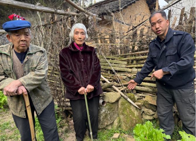 站在家中老屋原址,黄高凯(右一)和父母一同讲述当年红军战士在突围中牺牲场景。摄影|江西日报全媒体记者童梦宁