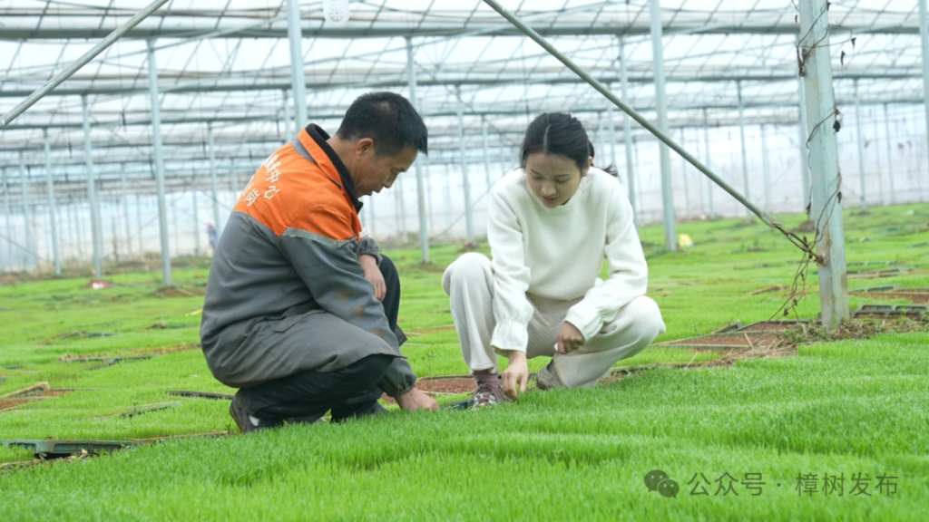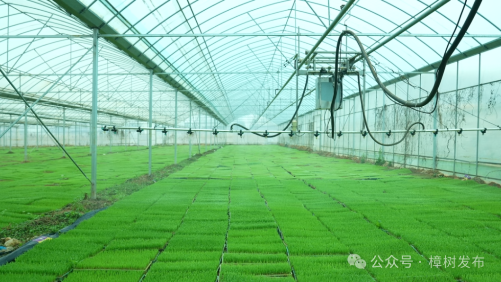 从暗化室出来后,秧盘被移入智能育秧大棚。蒋细平介绍,这些小苗再在大棚里生长25天左右,就能达到最佳插秧标准。大棚内安装了温度监测设备和自动喷淋系统,温度、湿度等数据实时采集,工人们可以按需调节水肥供应。无论外界天气如何变化,棚内始终保持着最适合秧苗生长的环境条件。